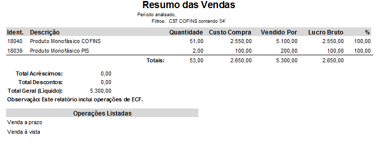 Esse relatório será gerado levando em consideração os dados filtrados, sendo assim irá gerar o resumo de vendas apenas dos produtos Monofásicos de PIS e COFINS.