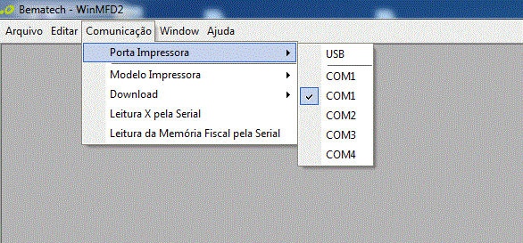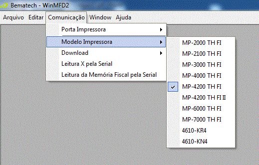 Para gerar o arquivo Ato Cotepe 17/04 (Arquivo enviado ao SEFAZ-ES para informar o uso da IF), primeiramente baixe e instale o Sotware WinMFD2 clicando aqui. Após ter instalado o WinMFD2 configure a porta de comunicação da Impressora Fiscal e o modelo da mesma.