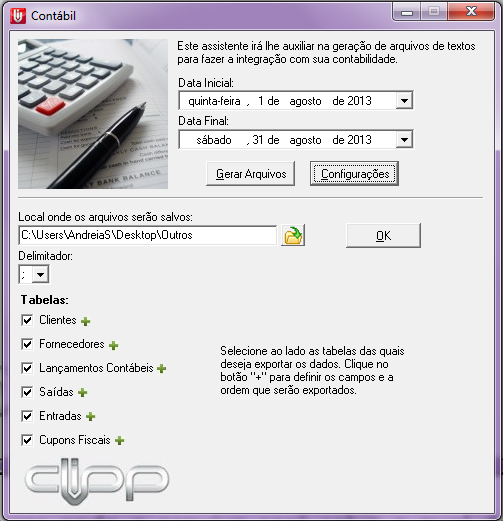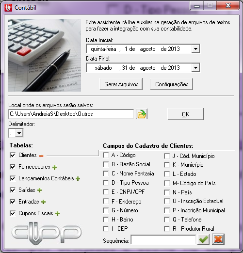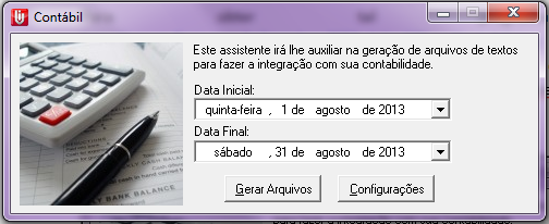O programa Contábil.exe, exporta em formato texto algumas movimentações necessárias para os programas de terceiros, este pode ser utilizando quando precisar importar para o sistema da contabilidade algumas informações geradas pelo ClippStore.