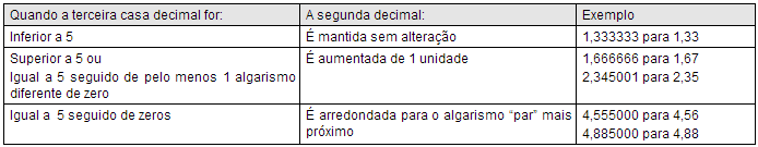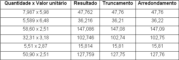 Veja a seguir alguns exemplos de valores, onde são aplicadas as regras de arredondamento e truncamento.