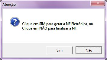 Feito o lançamento dos dados, ao finalizar a nota, será apresentada a mensagem “Clique em SIM para gerar a NF Eletrônica, ou Clique em NÃO para finalizar a NF”, clique em Sim.