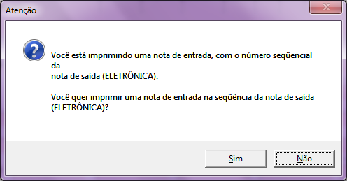 Ao clicar em Sim, será apresentada a mensagem “Você está imprimindo uma nota de entrada, com número sequencial da nota de saída (ELETRÔNICA). Você quer imprimir uma nota de entrada na sequência da nota de saída (ELETRÔNICA)?”, clique em Sim.