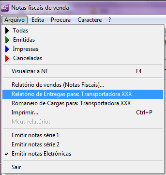 Para gerar o Romaneio de Cargas, clique sobre a nota que contém a transportadora desejada, após ainda no módulo de nota fiscal de venda clique no menu Arquivo / Romaneio de Cargas para: a transportadora desejada.