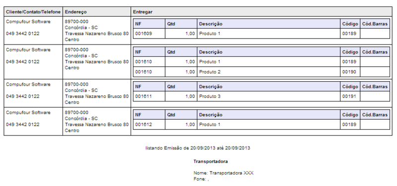 Em cada nota fiscal emitida é solicitada a transportadora responsável pela entrega (frete). Tendo essa informação é possível listar produtos e quantidades, bem como todas as entregas a serem realizadas por uma determinada transportadora num período pré-definido pelo usuário.