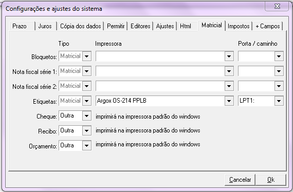 Para configurar o sistema, abra o Aplicativos Comerciais, clique no módulo Configurações e Ajustes / Opções / Matricial e na opção Etiquetas selecione a impressora Argox OS-214 PPLB, na opção Porta/Caminho selecione LPT1, conforme indicado na imagem abaixo.