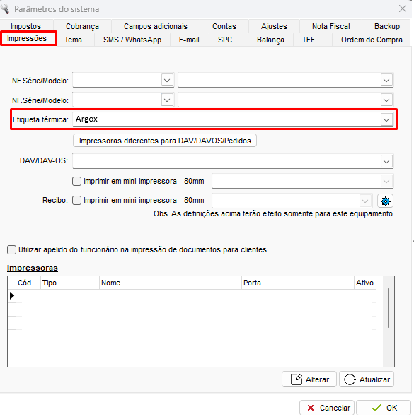 Em seguida acesse Configurações / Parâmetros / Impressões e selecione o nome da impressora configurada em Etiqueta Térmica: