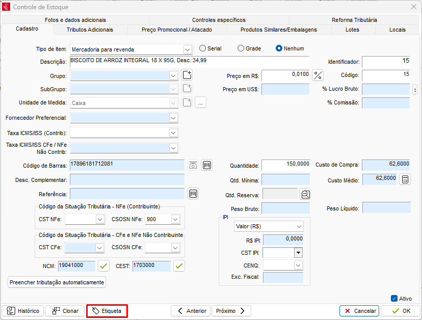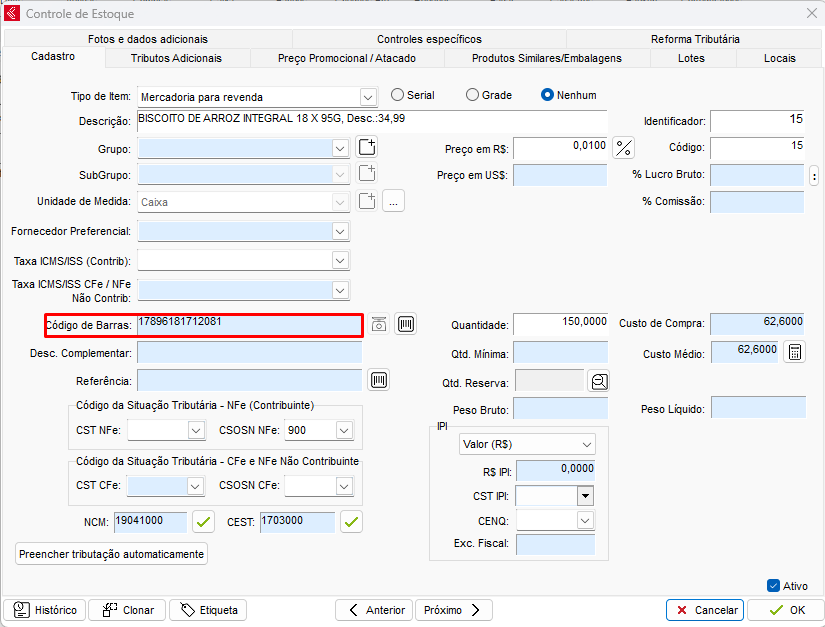 Após realizar a configuração, cadastre um código de barras para um determinado produto no módulo Estoque.