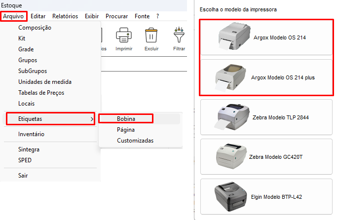 Outra forma de realizar, é indo no módulo de Estoque, no menu Arquivo > Etiquetas > Bobina > selecione a impressora Argox OS 214 e indique o modelo de etiqueta desejada e efetue testes, veja se está imprimindo normalmente.