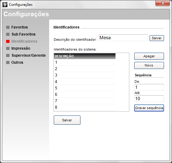 Para configurar os identificadores, basta clicar sobre configurações, será solicitado a senha do supervisor, após efetuar a inserção da senha correta do supervisor podemos efetuar a configuração dos identificadores conforme o controle interno da empresa. Neste exemplo estaremos atribuindo o controle através de cartões, dessa forma a descrição do identificador será Mesas, após definir a descrição do identificador devemos clicar em salvar. Após iremos informar quantos cartões a empresa disponibiliza para suas vendas. Neste exemplo iremos utilizar 20 cartões. Para atribuir o valor é necessário informar a sequência De (inserimos 1) Até (inserimos 20) e clicamos em gravar sequência, dessa forma teremos os controle pré definidos conforme próxima tela: