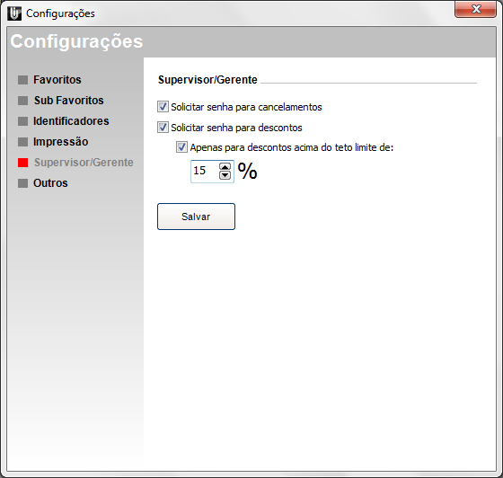 Nesta tela, é possível optar por configurar o sistema para que solicite a senha de Supervisor/Gerente para quando houver cancelamentos ou descontos ou descontos acima de um determinado teto limite.