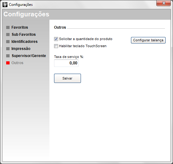 Nesta aba Outros é definida a opção pelo Supervisor se deseja que seja solicitada a quantidade do produto durante o lançamento da pré venda, além de poder configurar o percentual de taxa de serviço e habilitar o teclado TouchScreen.