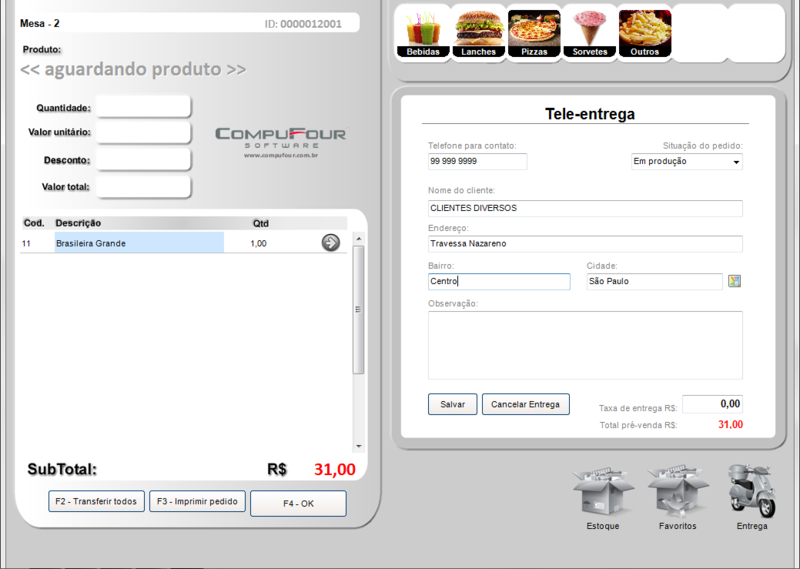 Nessa tela serão apresentados os seguintes campos: Telefone para contato, Situação do Pedido (Entregue, Saiu para entrega, em Produção), nome do cliente, Endereço, Bairro, Cidade (essas informações serão preenchidas automaticamente caso o cliente tenha sido informado na abertura do cartão), Observações e taxa de entrega. Após fazer o lançamento clique em salvar informações.