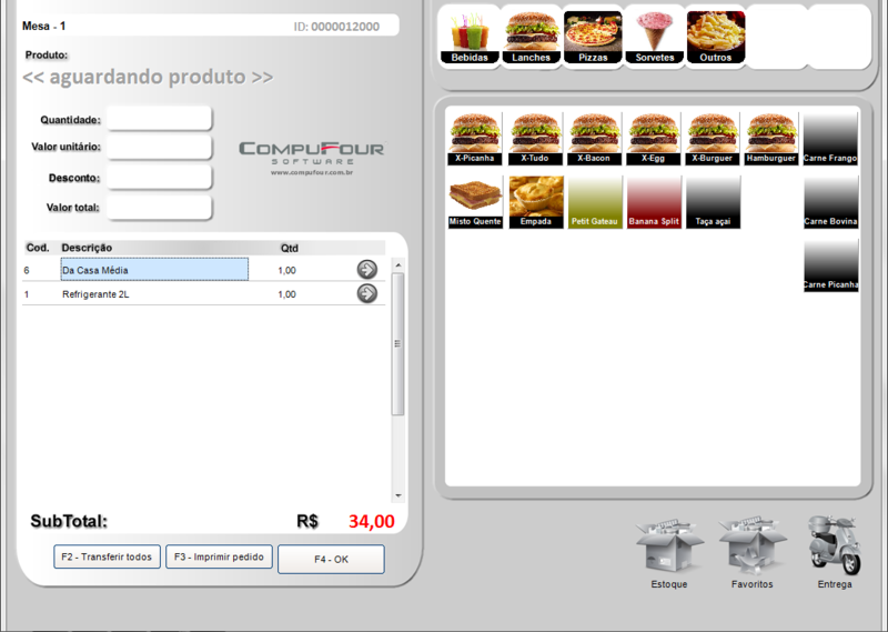 O primeiro passo é informar o número do identificador (comanda, mesa, cartão), após informar o cliente (não é um campo obrigatório, nesse caso se o cliente não estiver cadastrado irá assumir a descrição Clientes Diversos) e em seguida informar o código do vendedor, após pressionamos enter para iniciar o lançamento dos itens, se os dados informados acima estiverem corretos irá abrir a tela abaixo: