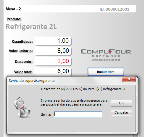 Ao lançar o item na comanda, é possível realizar o desconto, basta preencher o valor de desconto com o valor desejado e clicar na opção incluir item. Se a opção nas configurações estiver marcada para solicitar senha de supervisor ao realizar o desconto de um item na comanda sera apresentada a seguinte tela: