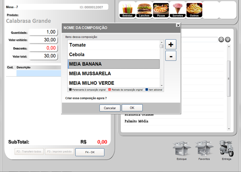 Nessa tela você poderá adicionar itens e tirar itens da composição, utilizando os botões a direita (+) e (-).