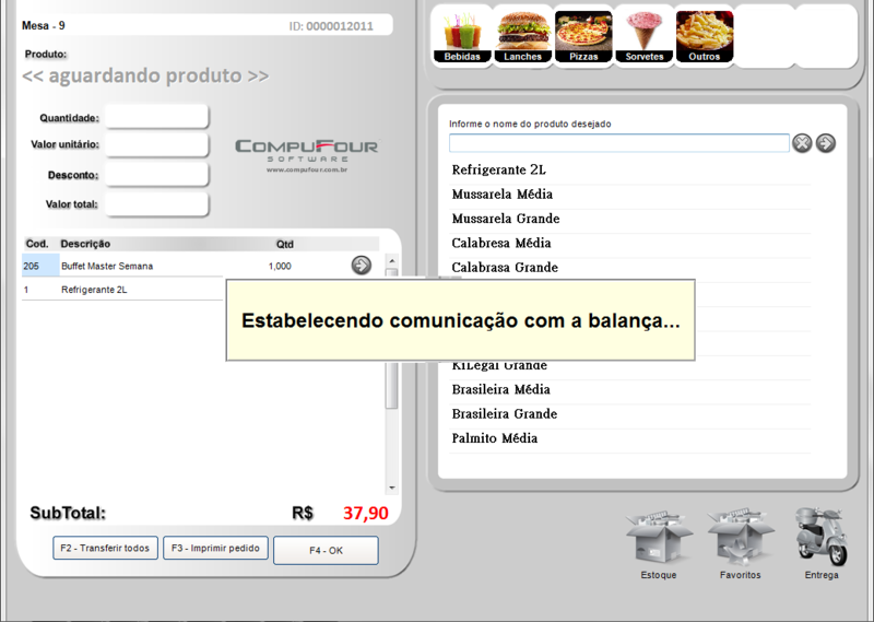 Nessa tela o sistema estará fazendo a comunicação com a balança e preencherá o campo QUANTIDADE com o peso recebido da balança.