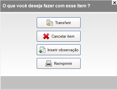 Transferir, Cancelar, Inserir observação e reimprimir um Item: Após lançar os produtos em uma pré-venda, ao lado de cada item o sistema mostra um ícone, clicando nesse ícone o sistema vai apresentar as seguintes opções: