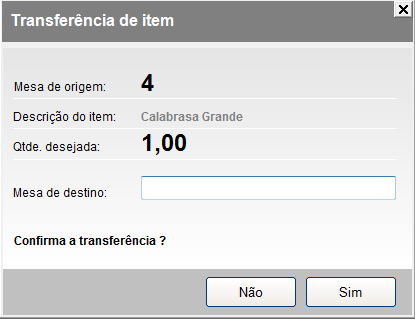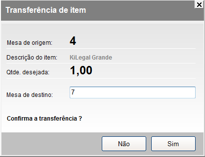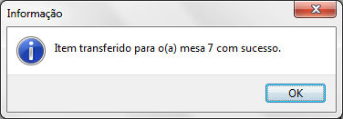 Informe o número do identificador (comanda, mesa, cartão) de destino (Ex. 7) e após confirmar a transferência o sistema irá exibir a seguinte tela: