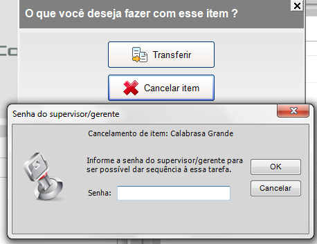 Cancelar item: Você pode cancelar um determinado item da comanda. Se a opção nas configurações estiver marcada para solicitar senha de supervisor ao realizar o cancelamento de um item na comanda sera apresentada a seguinte tela: