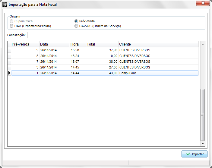 O módulo NFC-e também permite a importação/finalização de Pedidos de Venda, Orçamentos, Ordens de Serviço e Pré-Venda.