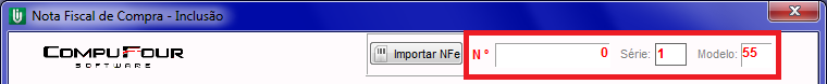 Feito isso, abra o módulo Compras, clique em Novo, digite para o número da Nota fiscal o número 0 (zero) (OBS.: deve ser preenchido com o Número “0” para que o sistema entenda que deverá seguir a sequência da numeração das notas de saídas). Após lançar a numeração 0 na nota, preencha o campo série (conforme a série usada para emissão de NFe). No campo Modelo, preencha com 55, pois é o modelo correspondente as notas eletrônicas.