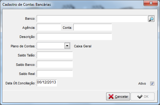 Informe o nome do banco, agência, conta, descrição e plano de contas, conforme tela a seguir. (Caso tenha dúvida no cadastramento dessa conta entre em contato com o banco.)