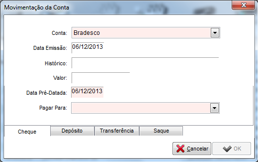 1. Movimentação via cheque: Como a conta já foi selecionada anteriormente, neste momento não é possível alterar a conta. É possível efetuar a alteração na data de emissão, informar o histórico na qual a operação se refere, valor, data pré-datada e informar qual será o plano de contas que o valor em questão estará sendo lançado. Para concluir basta clicar em OK.
