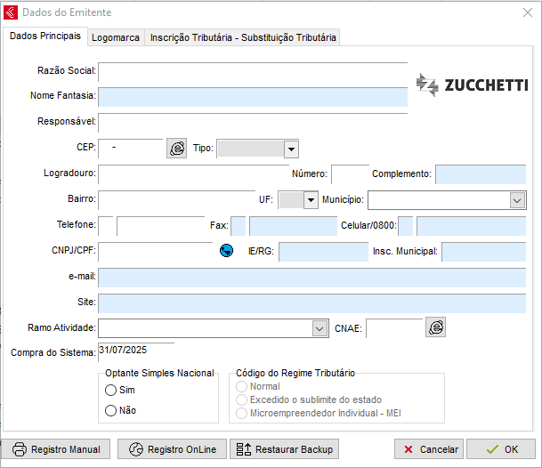 Após preencher todos os dados do Emitente, clique em OK para gravar as informações, em seguida acesse o novamente o menu Configurações > Emitente e clique no botão Registro Manual.