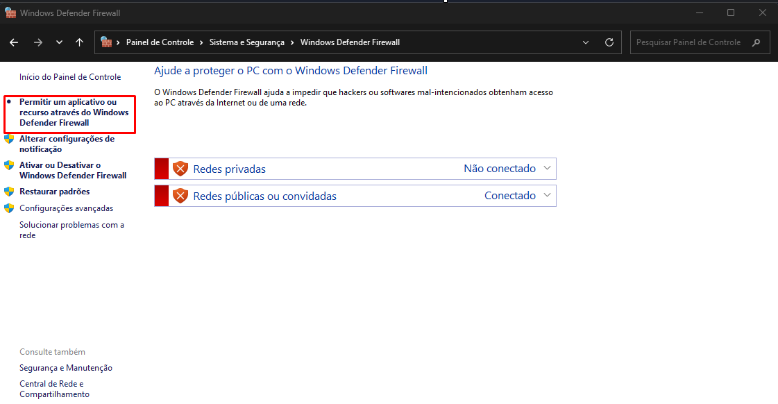 - Agora deverá acessar a tela para adicionar os executáveis como exceção, então clique sobre a opção Permitir um programa ou recurso pelo Firewall do Windows;