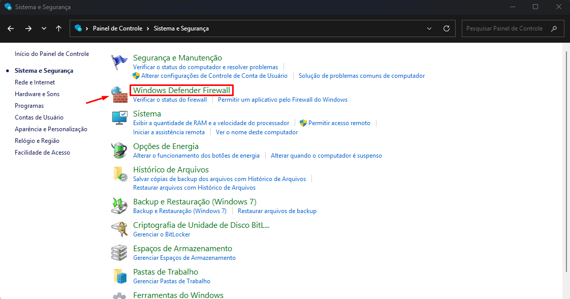 - Clique na opção Firewall do Windows;