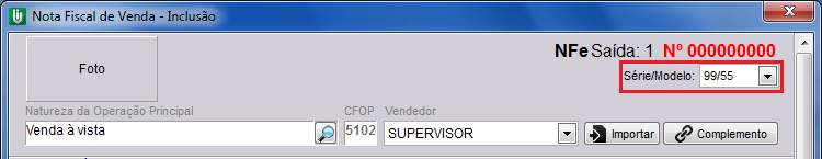 Após acesse no módulo de Nota Fiscal de Venda botão Novo, será solicitado o número da primeira Nota Fiscal (não terá problemas em utilizar na seqüência do que já utilizava) e no campo Série/Modelo selecione a mesma série definida anteriormente para emissão das notas (99/55). Conforme imagem abaixo: