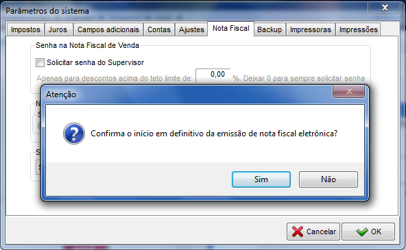 IMPORTANTE: Clicando em Sim será iniciado a emissão da NFe em ambiente de Produção, não podendo assim retornar ao ambiente de homologação.