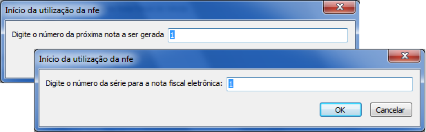 Ao clicar em Sim o sistema irá solicitar o número da primeira nota a ser gerada e série da NFe (a série para o ambiente de Produção poderá ser de 1 à 9, sendo que a primeira nota deverá ser número 1, caso já tenha utilizado outro sistema para emissão da NFe, deve configurar o sistema na seqüência do que já foi usado):