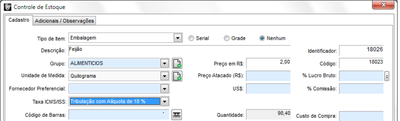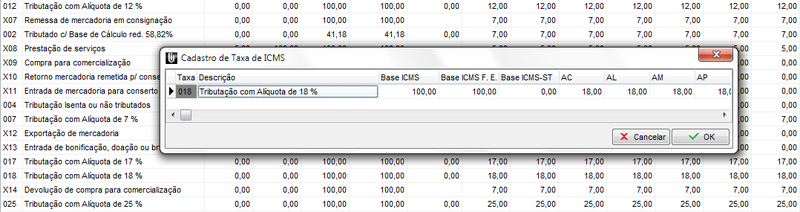 O campo Taxa de ICMS é utilizado para definir a situação tributária do item, se ele será tributado com alguma alíquota de ICMS especifica ou se o item será Isento, Não tributado ou com Substituição tributária.