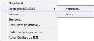 Primeiramente será necessário cadastrar as Taxas que serão utilizadas. Para isso acesse Configurações / Operações de ICMS/ISS / Taxas, conforme imagem abaixo: