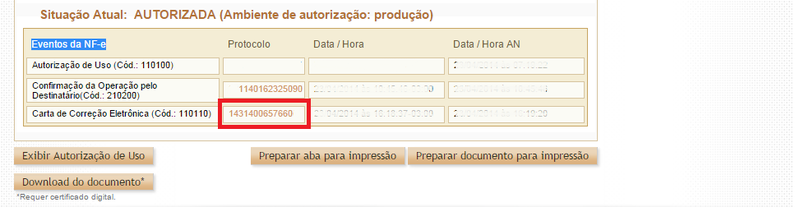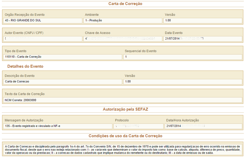 Ao clicar no número do Protocolo da Carta de Correção será exibida outra janela com as informações da CCe conforme exemplo abaixo: