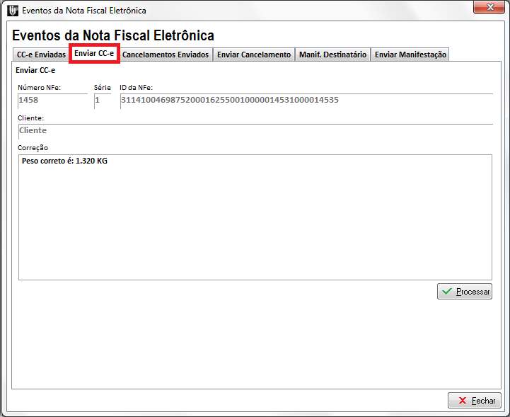 - Clique em Enviar CCe, confirme os dados da nota que constam nesta tela e lance a informação que deve ser ajustada, por exemplo: Peso correto é: 1.320 KG. (Esta informação deve conter no Mínimo 15 caracteres).