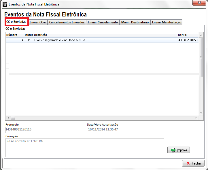 Para Imprimir esta Carta de Correção clique na guia CC-e Enviadas, selecione a carta de correção que deseja e clique em Imprimir. (A impressão será gerada na impressora definida como padrão no seu sistema operacional).