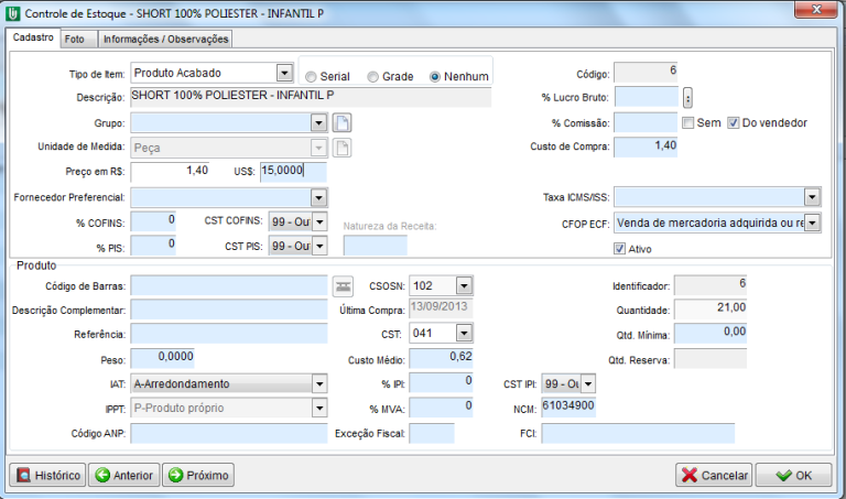 Para efetuar determinado reajuste, é necessário que acesse a ficha do item e preencha o valor de venda do produto em US$, como imagem abaixo.