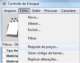Após preencher o valor do produto em dólar, clique no menu Editar e localize a opção de Reajuste de Preços, conforme imagem abaixo.