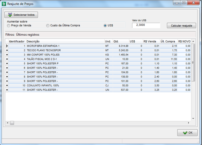 Quando clicar sobre a opção Reajuste de Preços, será apresentada a tela abaixo. Nesta janela marque a opção US$ e preencha com o valor atual do dólar. Na sequencia selecione os produtos que precisam ser reajustados e clique em Calcular Reajuste.