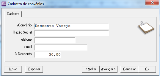 Após clicar em Cadastro de Convênios, clique no botão Novo na tela que será exibida e preencha o cadastro do convênio com que sua empresa trabalha. Preencha obrigatoriamente o nome do convênio e qual a porcentagem de desconto.