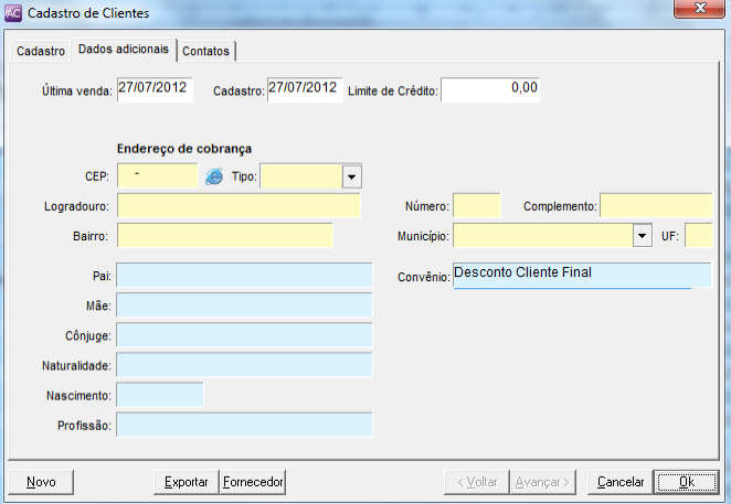 Depois de cadastrar o convênio, acesse o módulo Clientes, localize o cliente, na guia Dados Adicionais atribua o convênio desejado como exemplo abaixo. Depois de informar o convênio clique em OK.