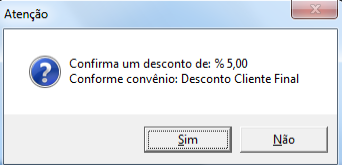 No momento em que fizer o lançamento do item, será apresentada tela de confirmação para atribuir o desconto conforme informado no convênio.