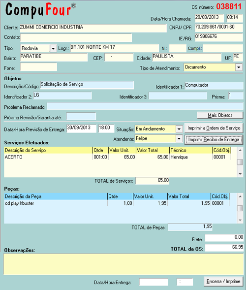Esta Ordem de Serviço não estará fechada, e ficará na cor vermelha na tela principal do módulo Ordens de Serviço. Esse procedimento apenas dará entrada dos objetos para conserto, possibilitando mais tarde a inclusão de serviços e peças na ordem de serviço.