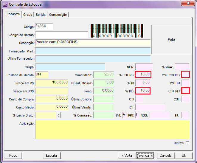 Primeiramente deverá ir ao módulo estoque, localizar o produto que possui PIS/COFINS e preencher os percentuais de PIS e COFINS dos mesmos. É necessário também informar o CST PIS e CST COFINS.