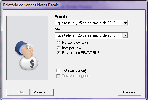 Após finalizar a nota, ainda no módulo de Nota Fiscal de Venda, clique no menu Arquivo / Relatório de Vendas (Notas Fiscais) / Informe o período desejado / marque a opção Relatório de PIS/COFINS e clique em Avançar.