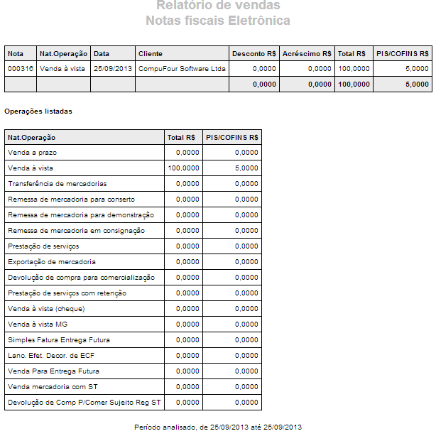 O relatório das notas fiscais de venda que foram lançadas com produtos que contém PIS/COFINS ficará da seguinte forma: