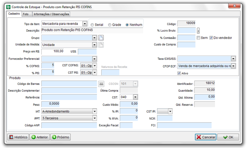 Primeiramente deverá ir ao módulo estoque, localizar o produto que possui PIS/COFINS e preencher os percentuais de PIS e COFINS dos mesmos. É necessário também informar o CST PIS e CST COFINS.