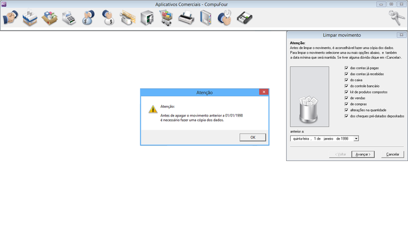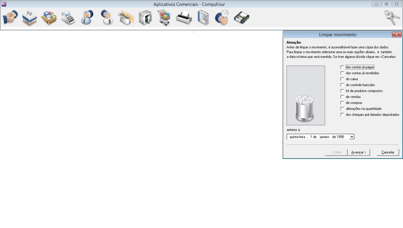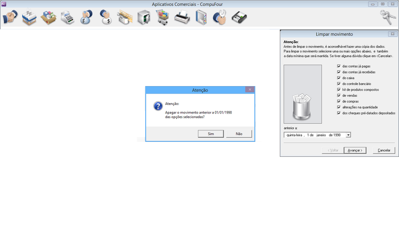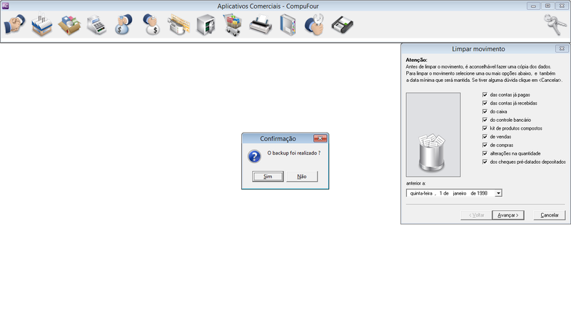Após marcar as opções desejadas e informar a data clique em avançar, será exibido uma tela de alerta, a mesma está alertando sobre a limpeza de movimento selecionada, informando que todo movimento anterior a data selecionada será apagado. Caso já tenha efetuado o backup e concorda com a limpeza, clique em sim.